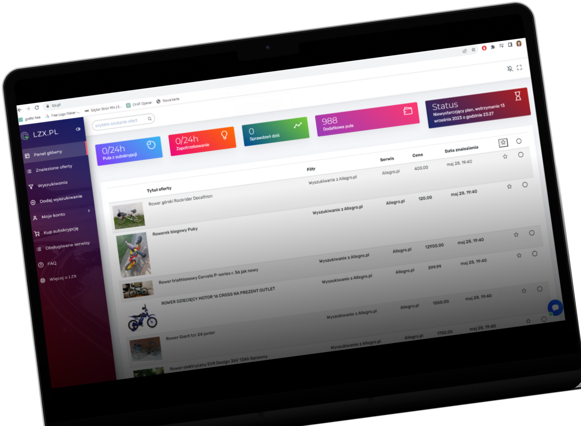 System LZX monitoruje podane przez Ciebie linki 24 godziny na dobę z ustaloną przez Ciebie częstotliwością (np. co 2, 5 lub 10 minut). Gdy tylko system wykryje nową ofertę spełniającą Twoje kryteria, powiadomienie trafia do Ciebie w ułamku sekundy.