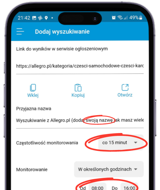 Pamiętaj by ustawić – częstość z jaką chcesz sprawdzać czy pojawiły się nowe oferty. Możesz też zadeklarować przedział czasowy w jakim mamy sprawdzać ogłoszenia (bo np. szansa, że ktoś doda ogłoszenie w nocy jest niewielka). Nadaj też własną nazwę wyszukania – ułatwi Ci to orientację, jeśli sprawdzasz więcej niż jeden przedmiot.